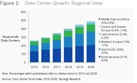 Frem til 2020 forventes antallet af hyperskala datacentre at stige til omkring 500, og landene i Asien, med Kina i spidsen, vil i de nærmeste år øge deres andel af det samlede antal centre.