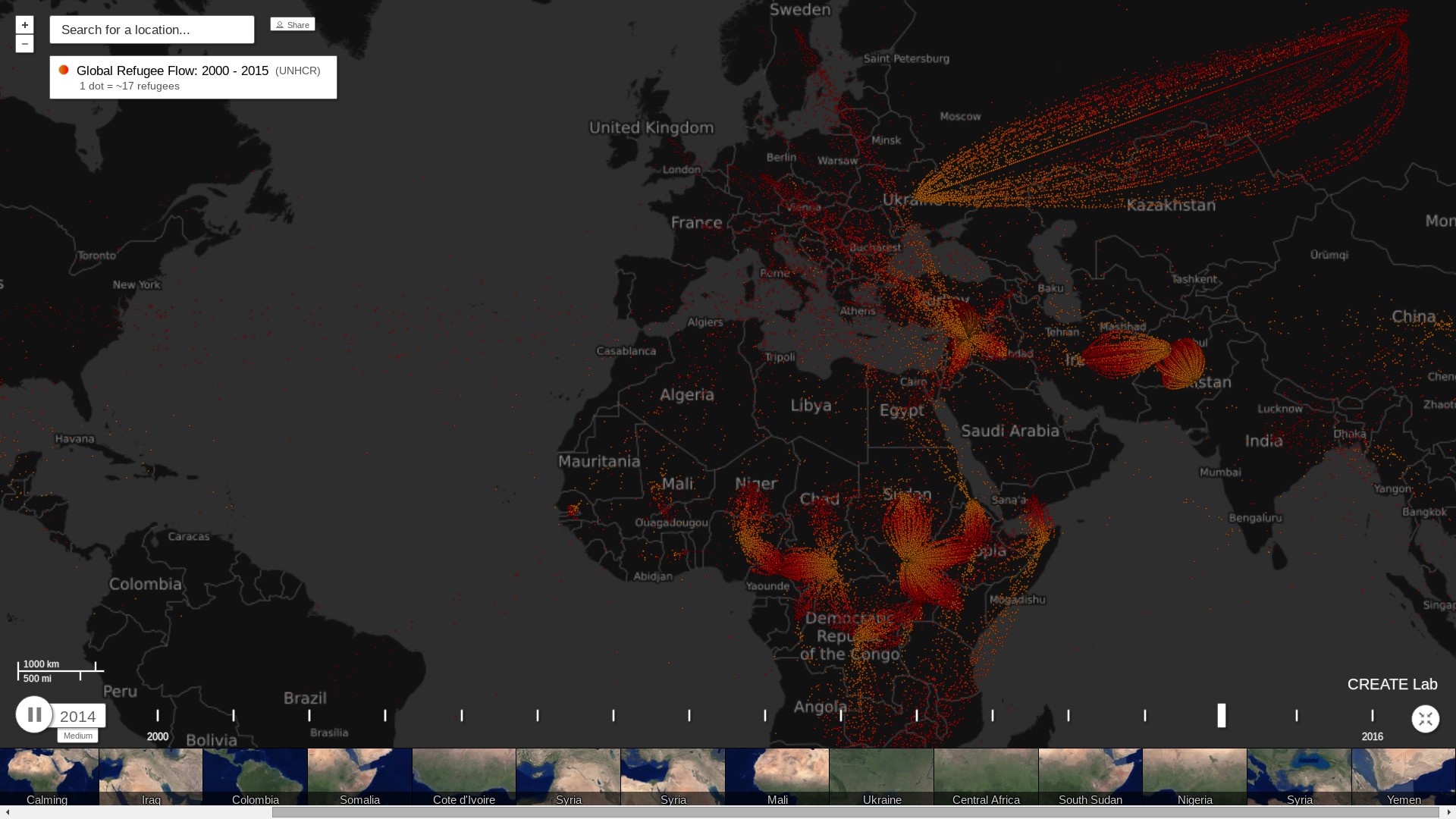 Et godt eksempel på denne udvikling stammer fra Carnegie Mellon University’s Community Robotics, Education, and Technology Empowerment (CREATE) Lab hvor en gruppe forskere for nylig har offentliggjort et redskab, der kan visualisere den globale strøm af flygtninge i perioden 2000 til 2015.