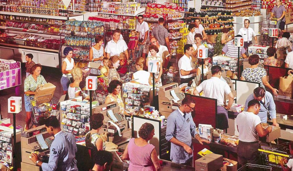 Introfoto: Supermarked, USA, 1960. Supermarkedet er stadig den dominerende butikstype i dagligvarehandlen i Europa.