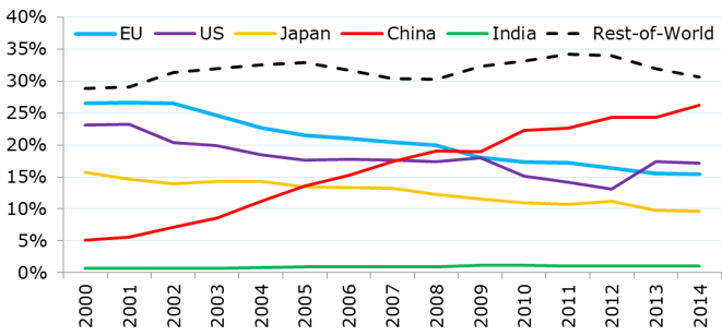 Andel af den globale værditilvækst i elektronikindustrien, 2000 – 2014